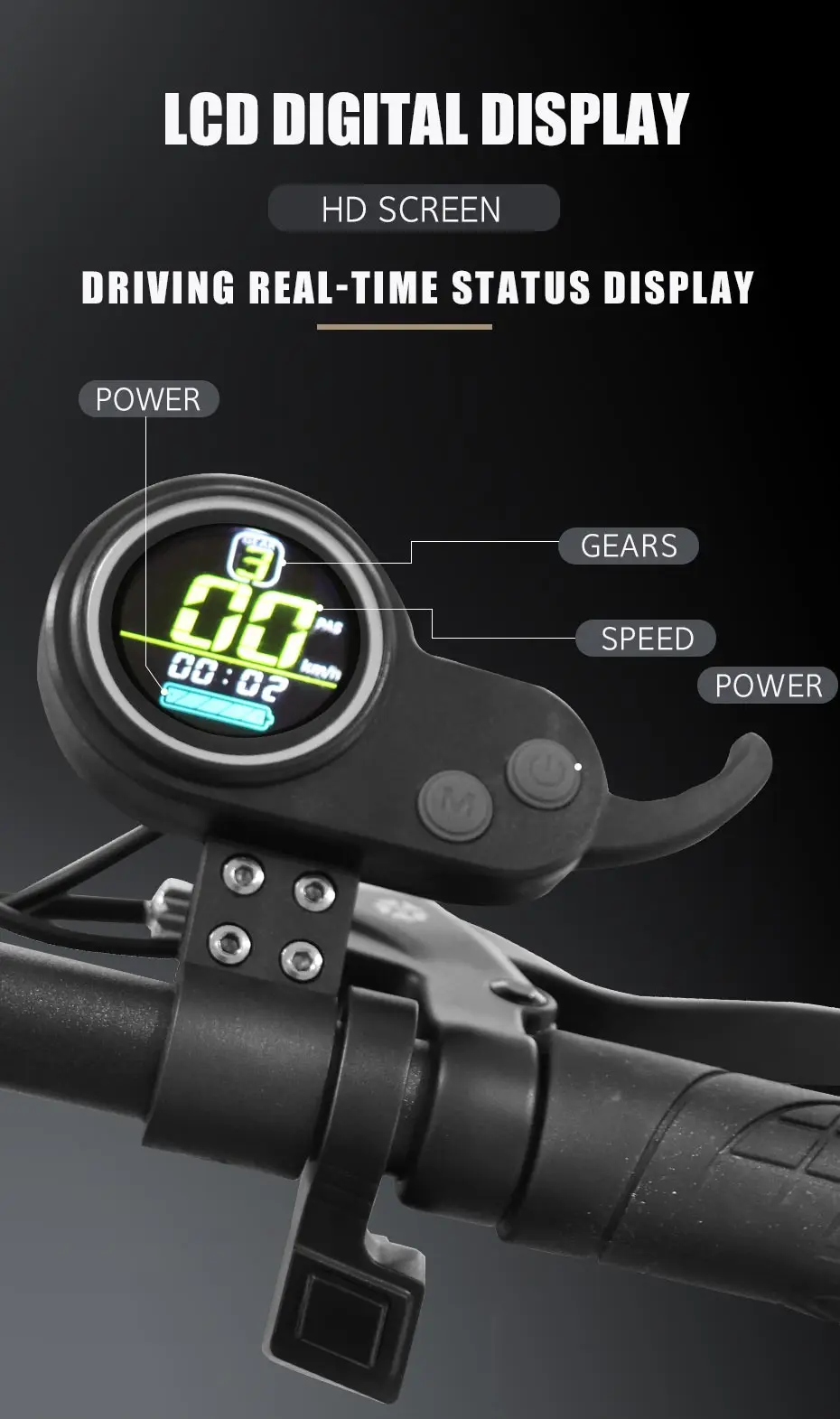 Including LCD display with finger throttle, light switch, turn signal control, horn switch, speed limit button and single/dual drive switcher.