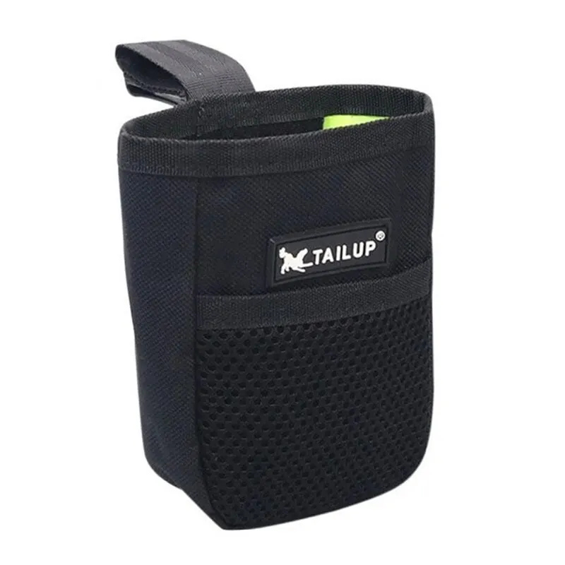 5, Training treat pouch has a mesh pocket on the outside to store pet poop bags.