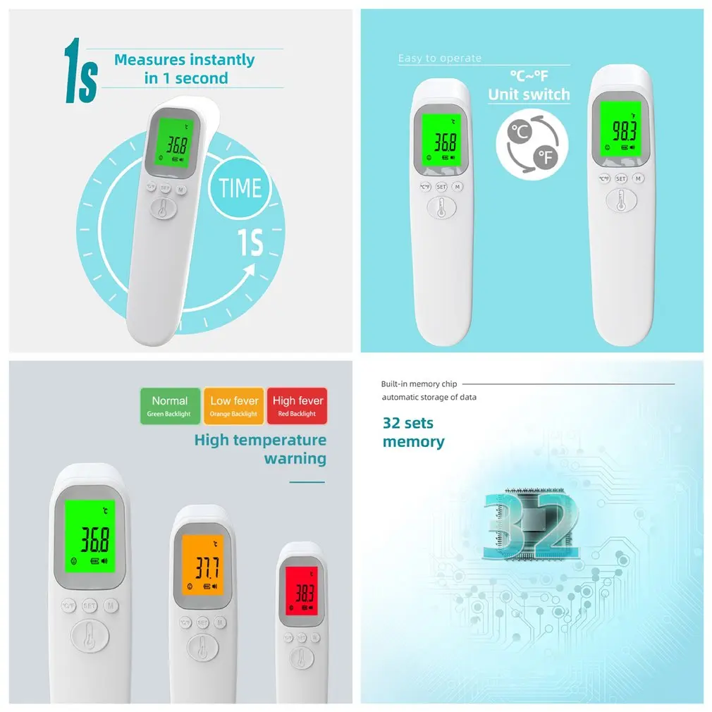 1. Quick temperature measurement in one second: Simple and convenient temperature measurement through the forehead, this thermometer is practical and accurate. There is also a high temperature alarm to indicate high temperature abnormalities, and the alarm will send out a didi warning.